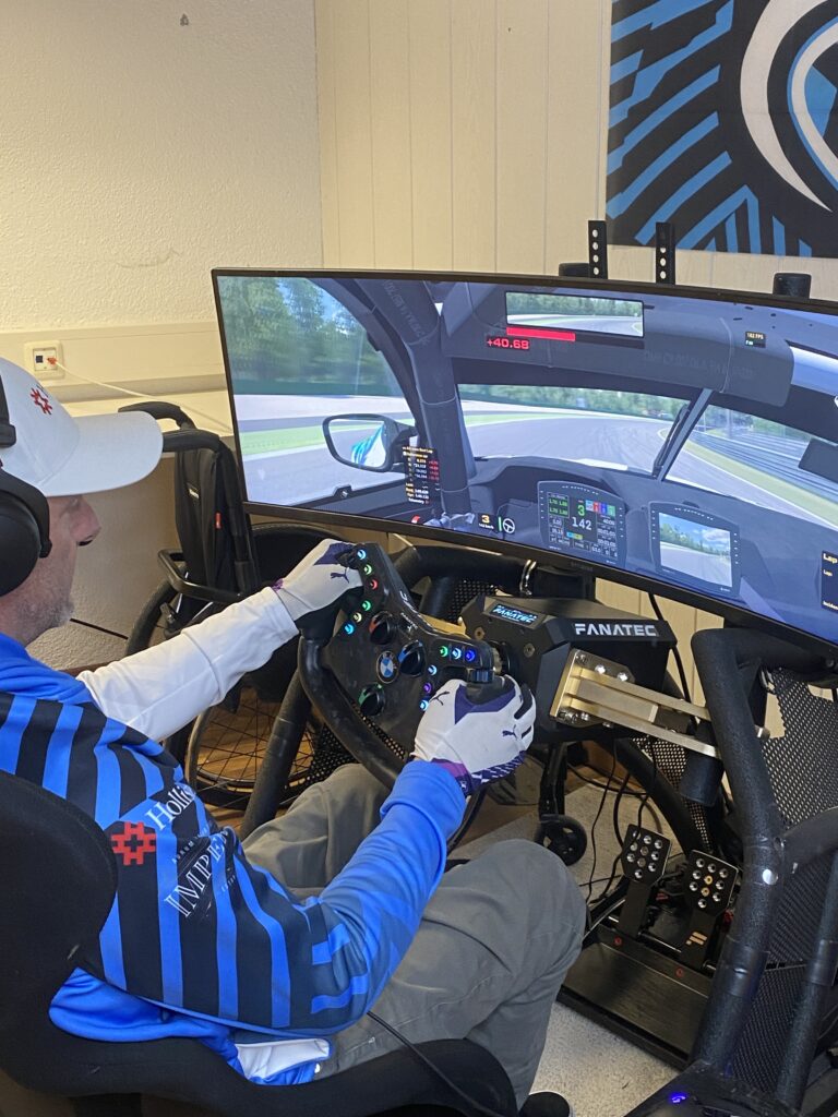 Zur Vorbereitung auf neue Strecken, Autos und zum Training arbeitet Andi zuhause an seinem BMW-Simulator mit umgebauten Fanatec-Lenkrad.